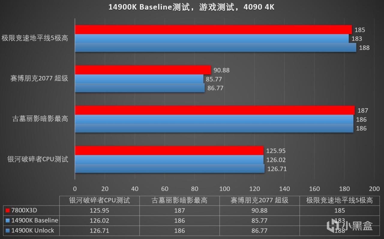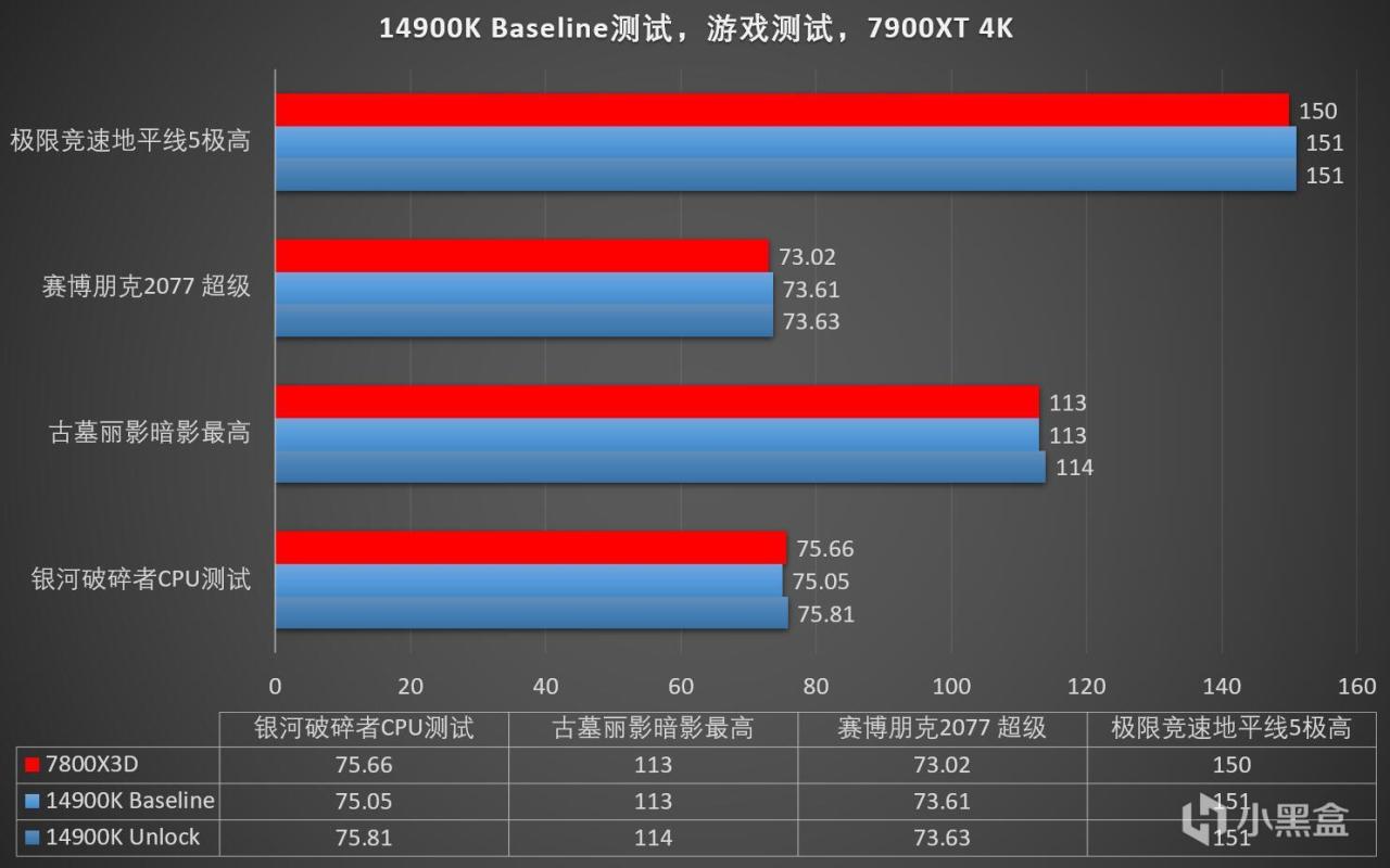 4K成绩就稍好一点,毕竟4K是真的众生平等,但是依然体现了14900K本来稍微超出7800X3D一点点,开了baseline之后就刚好低一点点的尴尬情况......