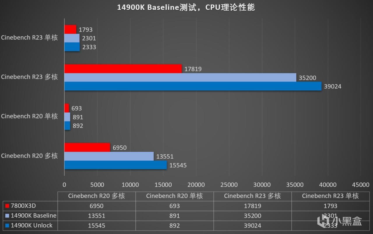 首先是理论性能,即便是开启了baseline,14900K的性能看起来还是那么“漂亮”:单核超过25%,多核更是几乎翻倍,毕竟可怜的7800X3D只有8个大核,没有像14900K那样带着16个凑分小核,而且7800X3D最高单核频率也只有区区5.0GHz,理论成绩被两倍价格的14900K暴打也是正常的——但是游戏呢?