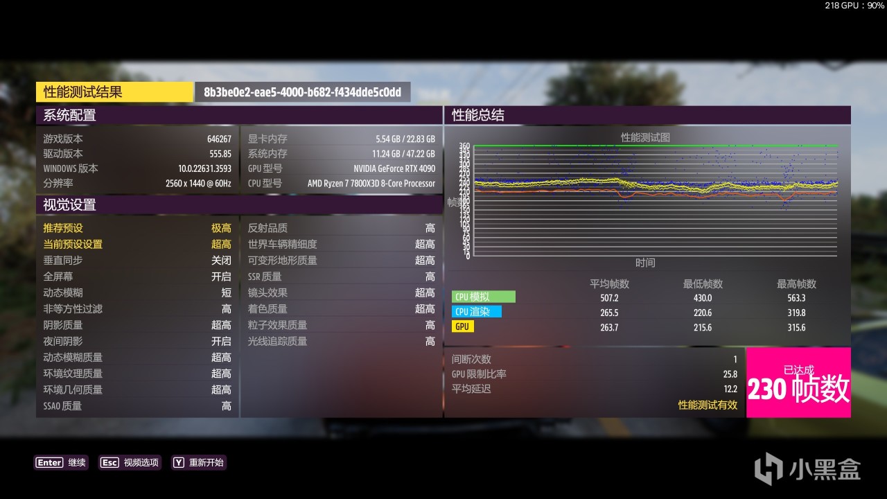 对比7800X3D,CPU模拟高达平均507.2、最低430.0、最高563.3,而CPU渲染也有平均265.5、最低220.6、最高319.8,比解锁的149K都高,自然比baseline总帧数高出10%也不奇怪了。