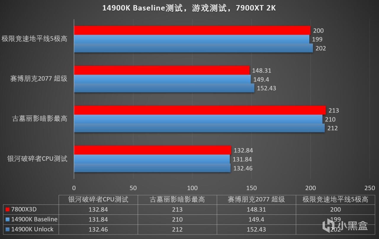 游戏成绩就非常有意思了!首先看CPU相对负载较重的2K组,本来14900K和7800X3D的游戏性能就在伯仲之间,结果这次baseline一开,彻底打不过了——要不然Intel也不会硬挤个400W的14900KS出来。
