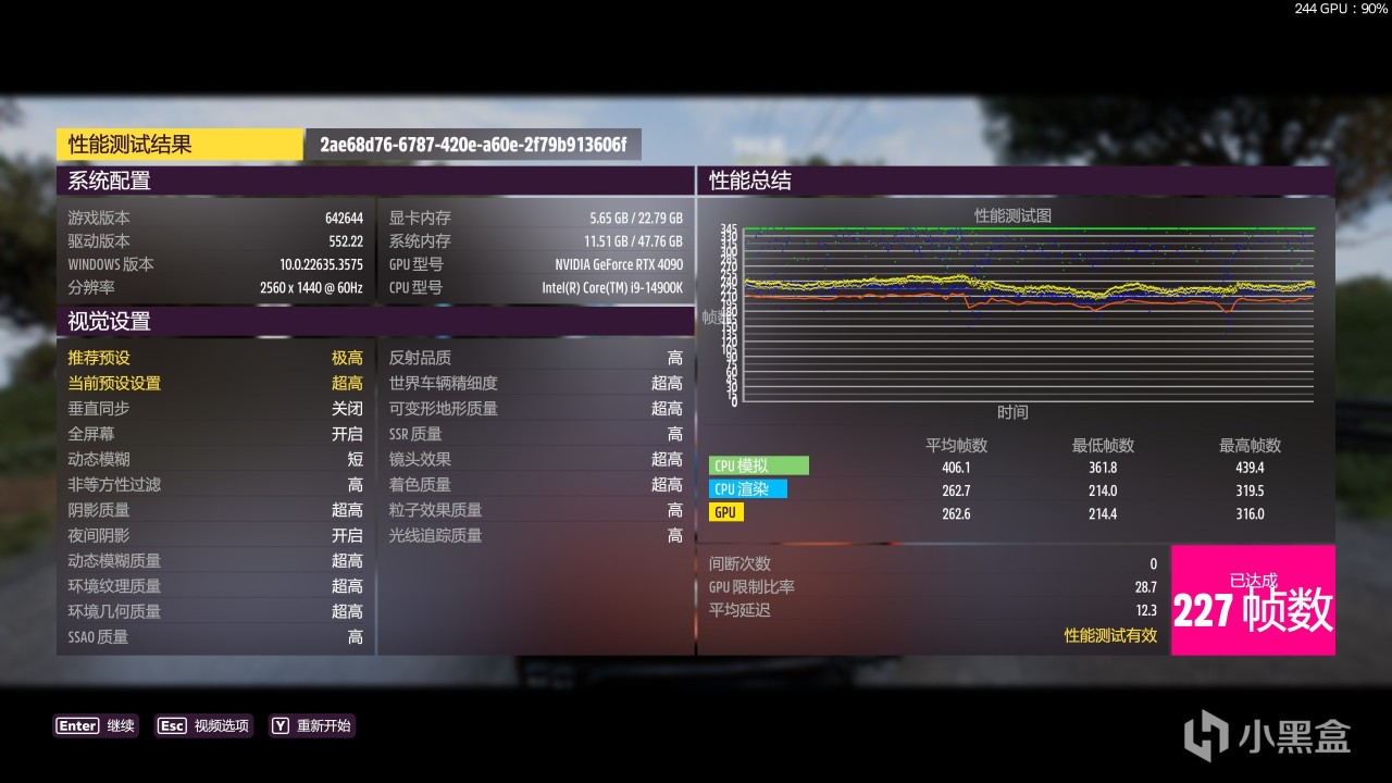 首先看一下解锁的14900K搭配4090在2K分辨率下的情况,CPU模拟帧数平均406.1、最低361.8、最高439.4,CPU渲染平均262.7、最低214.0、最高319.5: