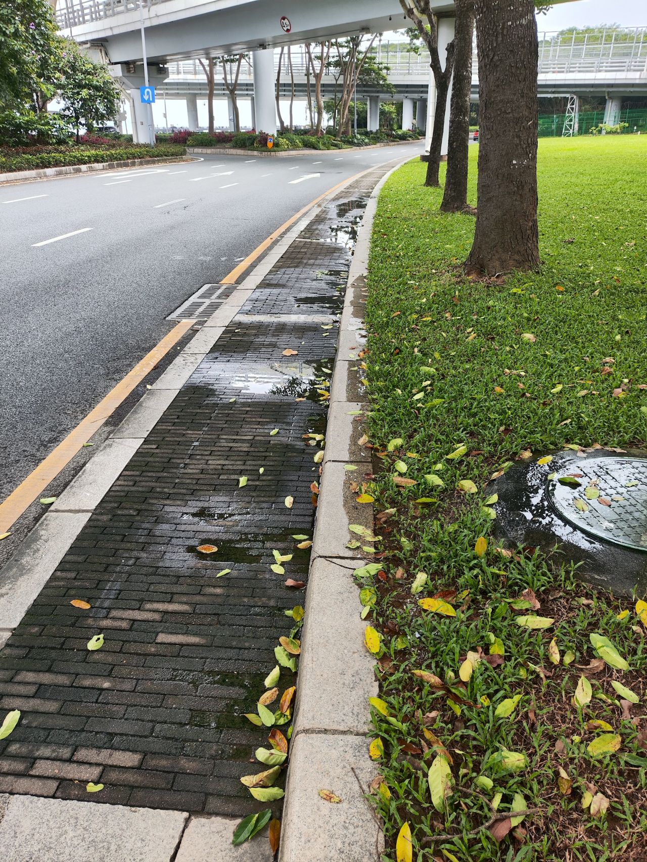 因为没戴眼镜,沿着路一直以为前面青绿的是青柠单车,走近一看,不是环卫工人的衣服便是他们装满落叶的绿色麻袋。那就再走一段路好了。这段路车来来往往,行人缺少见,借助着汽车轧过马路的轰鸣,我肆意地唱起了歌,很大声地、尽情地唱。左边是呼啸而过的车辆,右边是郁郁葱葱的植被,我走在一条狭窄的路上,身后是我落地的音符。