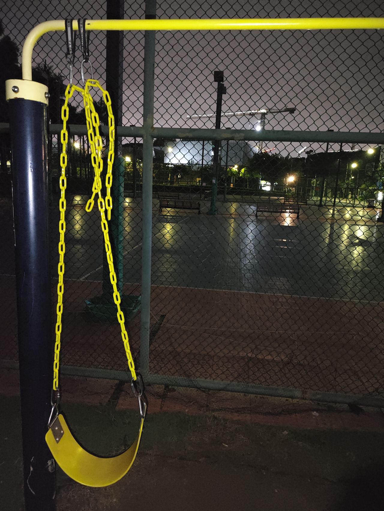 走去引体向上的时候,突然发觉单杠一侧丑丑地挂着秋千。秋千荡不起来,在一片漆黑中孤零零地被丢弃着。所以我坐着左摇右晃。