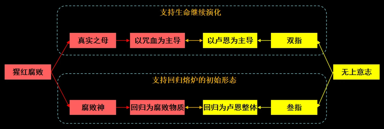 血液真的源於猩紅腐敗嗎?儘管我在本文最開頭的時候就提出了這一推論,但現在仍難以擔保。不過試想,如果說生命熔爐中的黃金能量會分裂爲雙指和叄指,那麼,猩紅腐敗中的紅色能量也可以分化爲“腐敗神”和“真實之母”。其中,腐敗神是生命熔爐的反對者,它希望消滅所有生命,迴歸於無序的腐敗物質。而真實之母是生命熔爐的支持者,它希望生命能繼續演化,但要排斥掉對抗的黃金能量,而化作爲屬於自己的詛咒之血。
