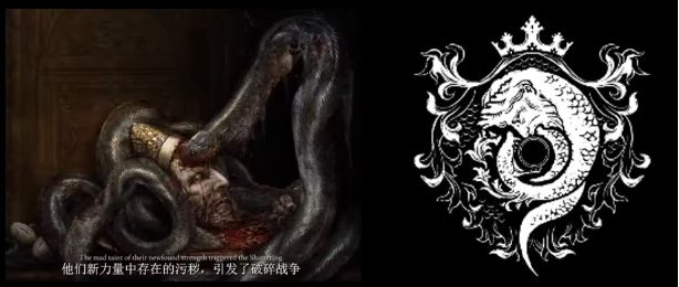 "蛇"顯然是遊戲中褻瀆的代表物。蛇在神話宗教場景中一般都包含銜尾蛇的意向,即自我循環、自我吞噬等,從拉卡德所代表的紋章印記中更可以證明這一點。褻瀆的本質就是迴歸生命熔爐,而相比於同樣意圖的叄指癲火,褻瀆的迴歸更偏向於生命的本能意志,而非外部力量驅使。