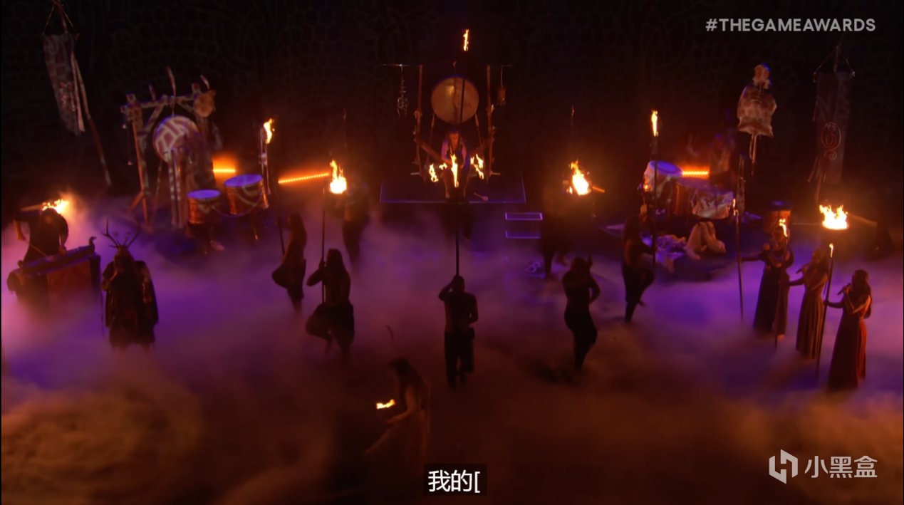 舞臺上,一個女人用布條遮住了上半邊臉,她頭戴鹿角頭飾,手裏握着一根燃燒着火焰的樹枝,嘴裏還唸叨着大部分人都聽不懂的語言。緊接着,她身後的其他男人也都出現在了畫面裏,他們個個赤裸着上身,手持盾牌和長矛,一整個頗具野性力量的原始部落出現在了觀衆眼前。隨着鼓點節奏的加快,他們在煙霧中圍成一圈,像是在舉行一個神祕的祭祀儀式。