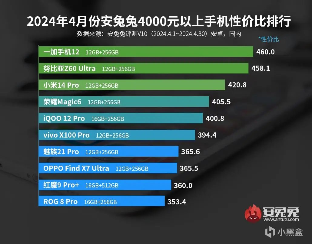 一加12手机作为一加品牌的十年旗舰之作,从性能、屏幕、影像、续航、设计等方面进行了全面升级,可以说是4-5k档位产品力最强悍的数字旗舰,它连续4个月霸榜安兔兔4000元以上旗舰手机性价比排名第一(2024年安兔兔1月、2月、3月、4月四个月霸榜第一)。