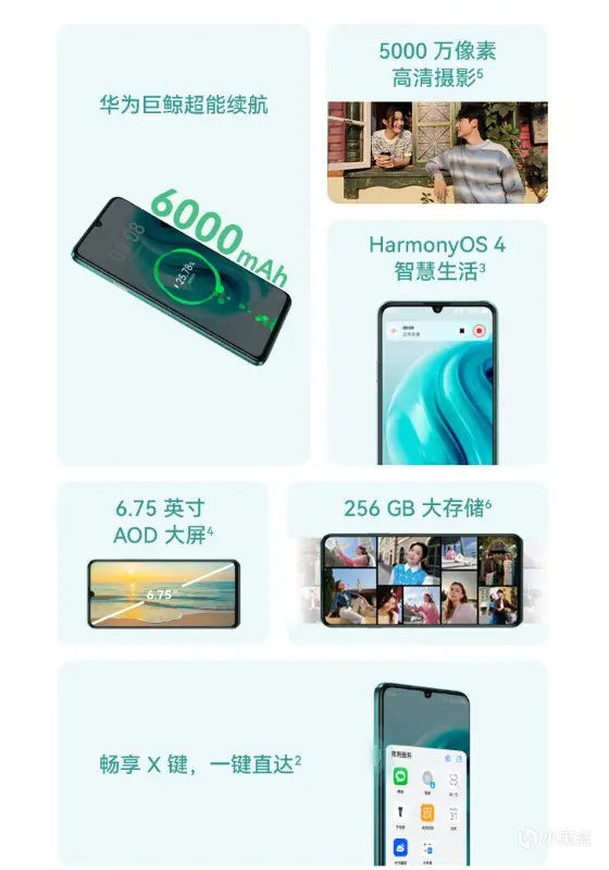 华为畅享70搭载自研麒麟710A芯片,配备6.75英寸大屏;内置6000mAh超大电池,辅以22.5W华为超级快充,确保长效使用与快速补电,摄像头采用5000万像素后置主摄与4cm微距摄像头组合,提供清晰成像与细节捕捉能力。搭载鸿蒙OS,拥有畅享X键,一键开启应用九宫格,支持双击与长按快捷启动指定APP,提供个性化便捷操作。