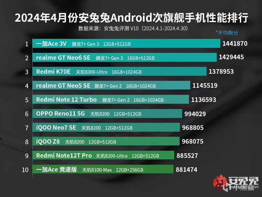 安兔兔4月安兔兔次旗舰手机性能排行榜,一加Ace3V排名第一。