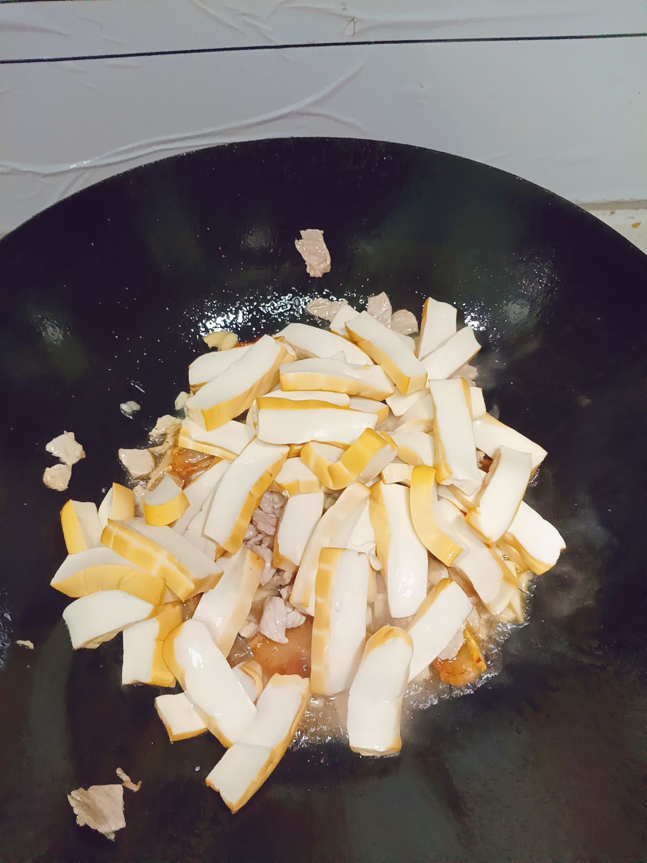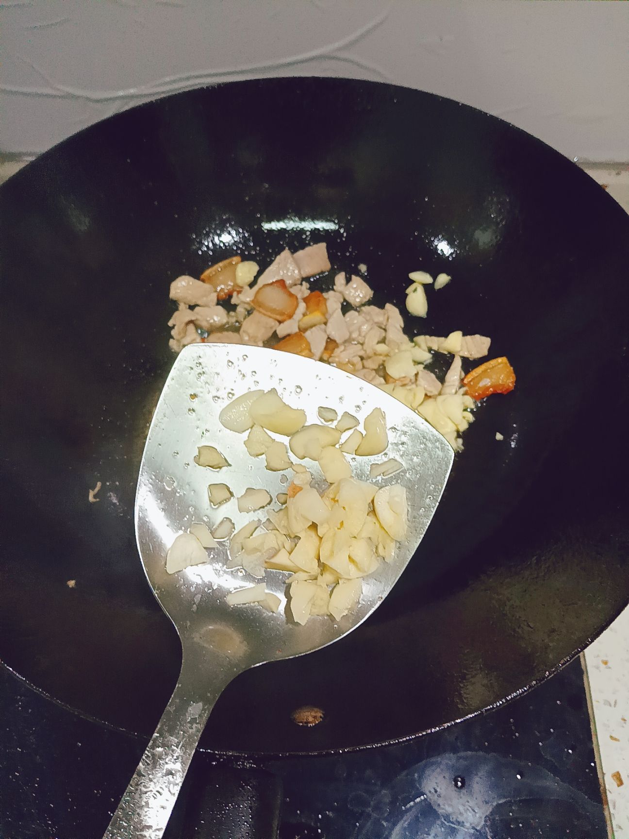 锅热,锅中放一点点油,把肥肉炒出多余的油,再放瘦肉煸炒变色。【持续中小火】