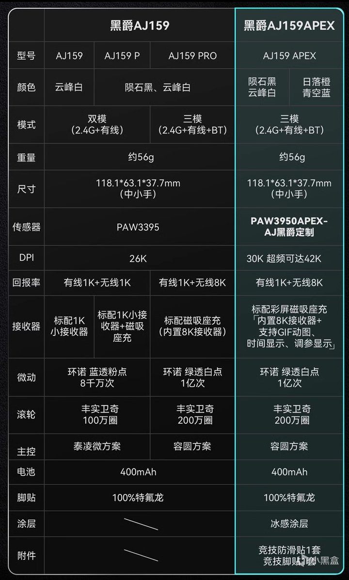 从P版本(129元)开始都会标配RGB磁吸充电底座,方便充电的同时放在桌面上会更加好看。整体性价比非常高最高版本AJ159 APEX是3950传感器,价格只要309元,同样非常值得入手。版本太多直接放参数图: