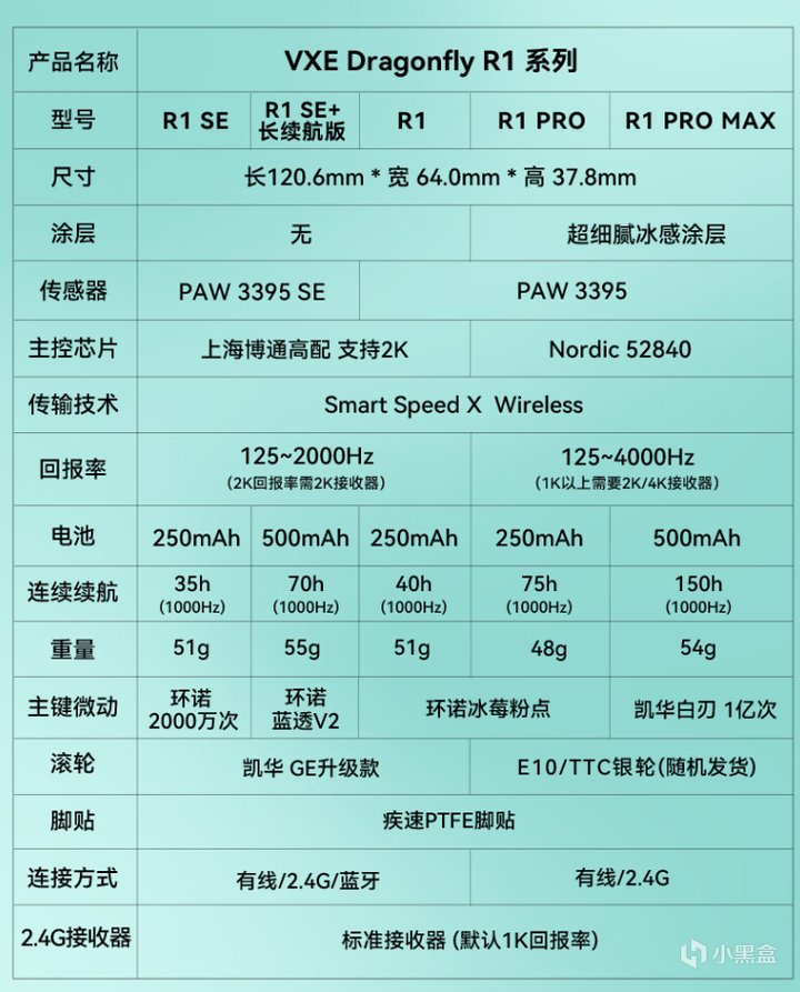 标准版:博通BK+3395+凯华黑曼巴微动+TTC银轮 60gPRO MAX版本:诺迪克52840+3395+凯华白刃+TTC金轮 65g