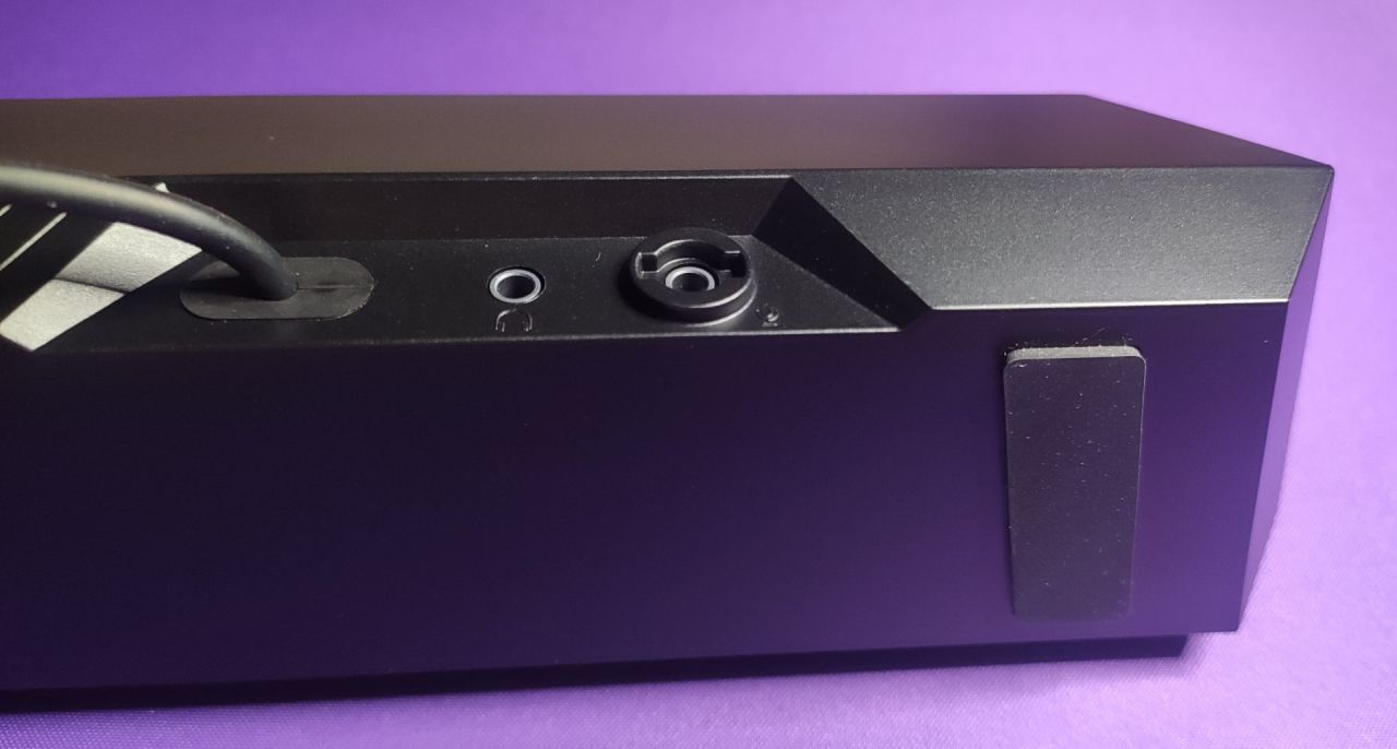 硅胶脚垫可以稳固防滑,以及减震防抖,音箱上 3.5mm 接口可接入耳机,获得DSP声卡加持,普通耳机也能拥有7.1环绕音效功能,方便晚上使用,不会打扰到周围的人(你说话就另外算了)。