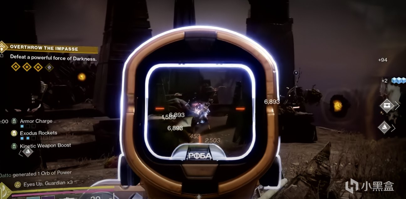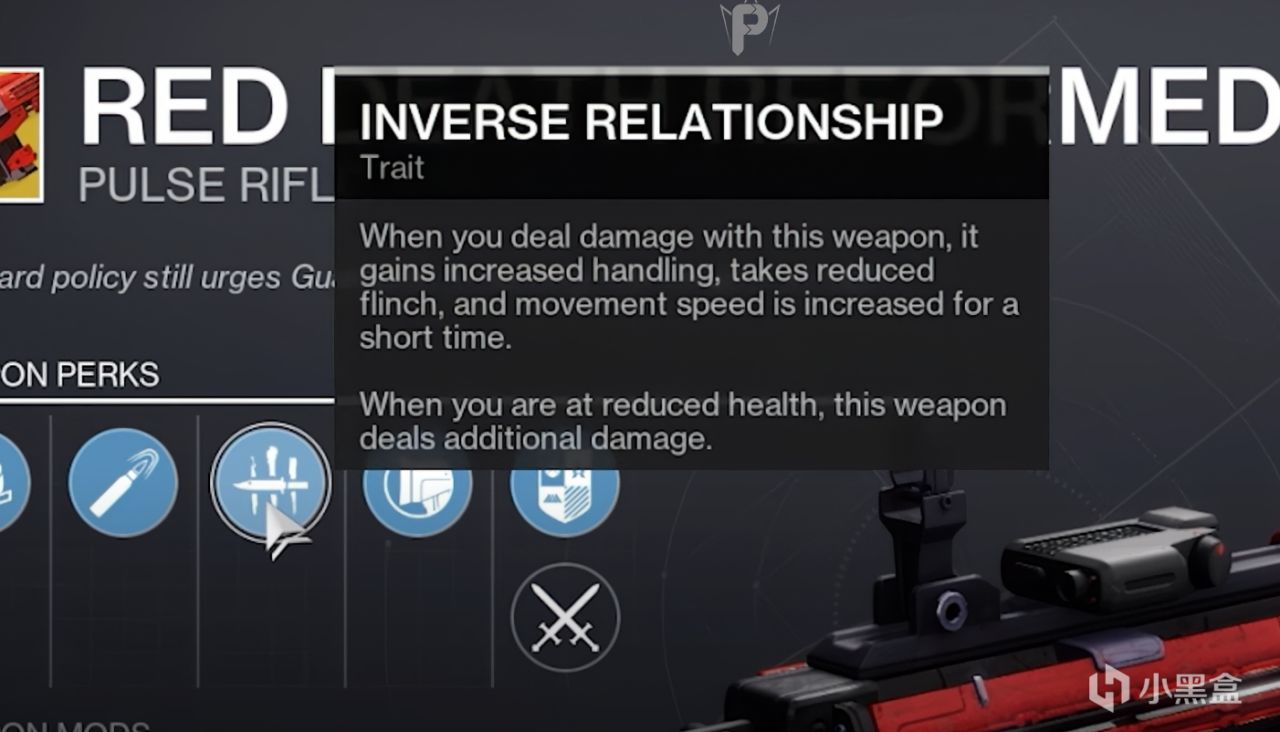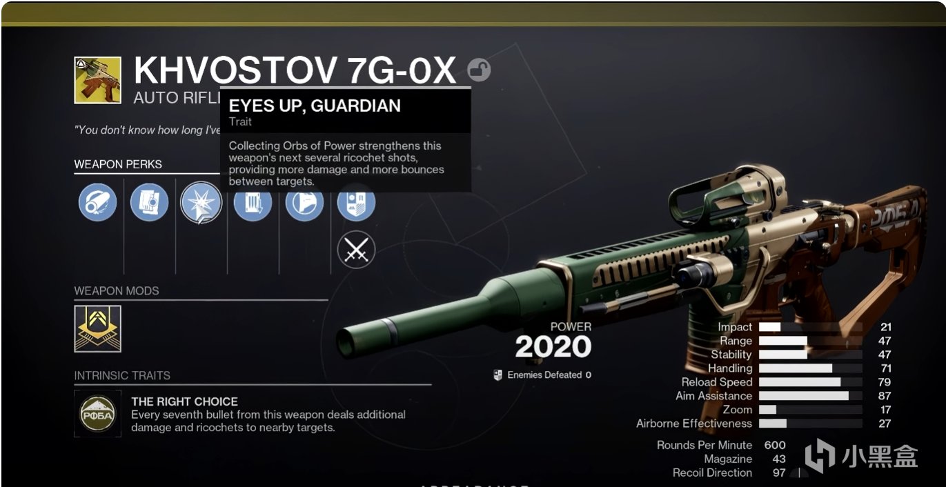 主彈藥動能異域自動步槍,特效“正確的選擇”:每7發子彈發生一次彈射(編者注:根據之前的訪談最多可以彈射7個敵人)並造成3.5倍傷害。特殊perk“注意了,守護者”:收集能量球提高下一次彈射子彈可以造成額外傷害並彈射更多目標,該buff最大可以疊加7層。武器自帶邊打邊劫,命中能量球可以直接疊buff