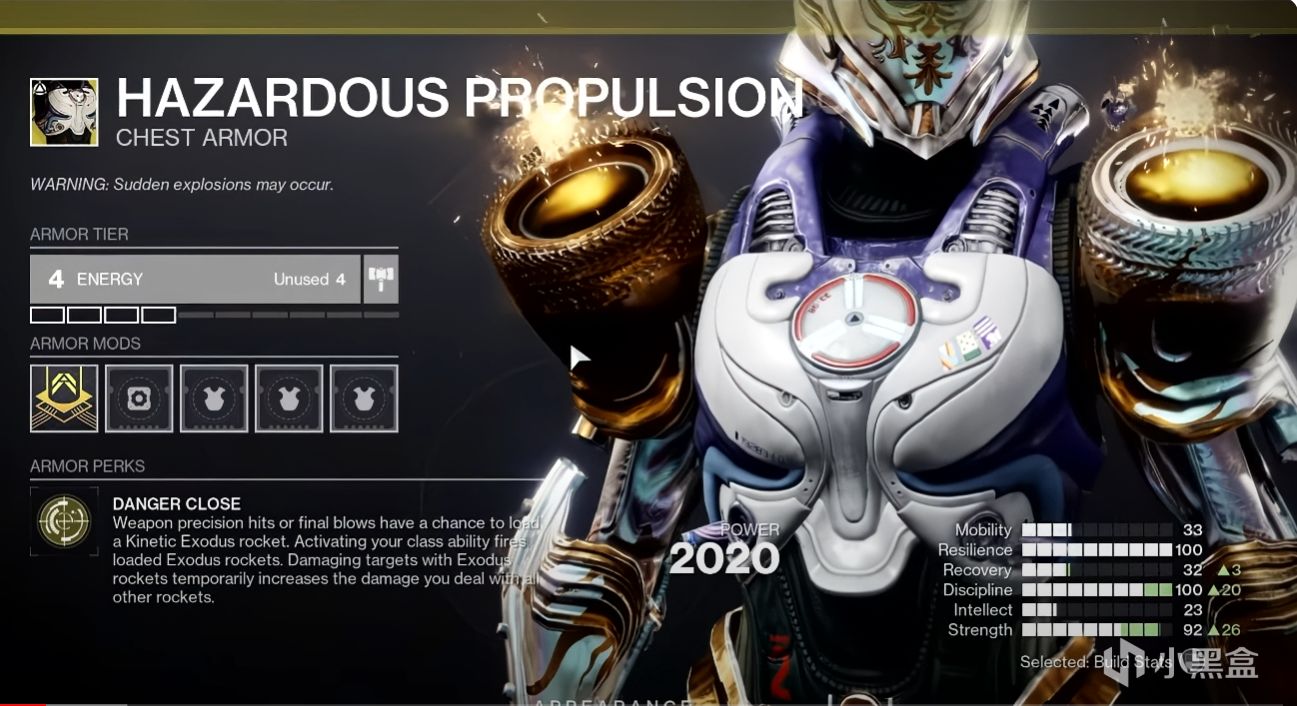 泰坦金胸甲“危險推力”,特殊技能“危險接近”:武器精準命中或者爆頭擊殺有一定幾率裝填1發動能追蹤火箭,最多可儲存6發。使用職業技能發射所有已裝填的追蹤火箭,使用火箭命中目標可以提高後續追蹤火箭的傷害35%。