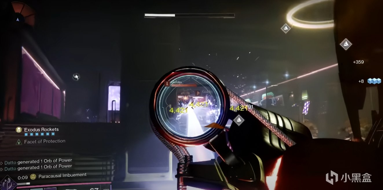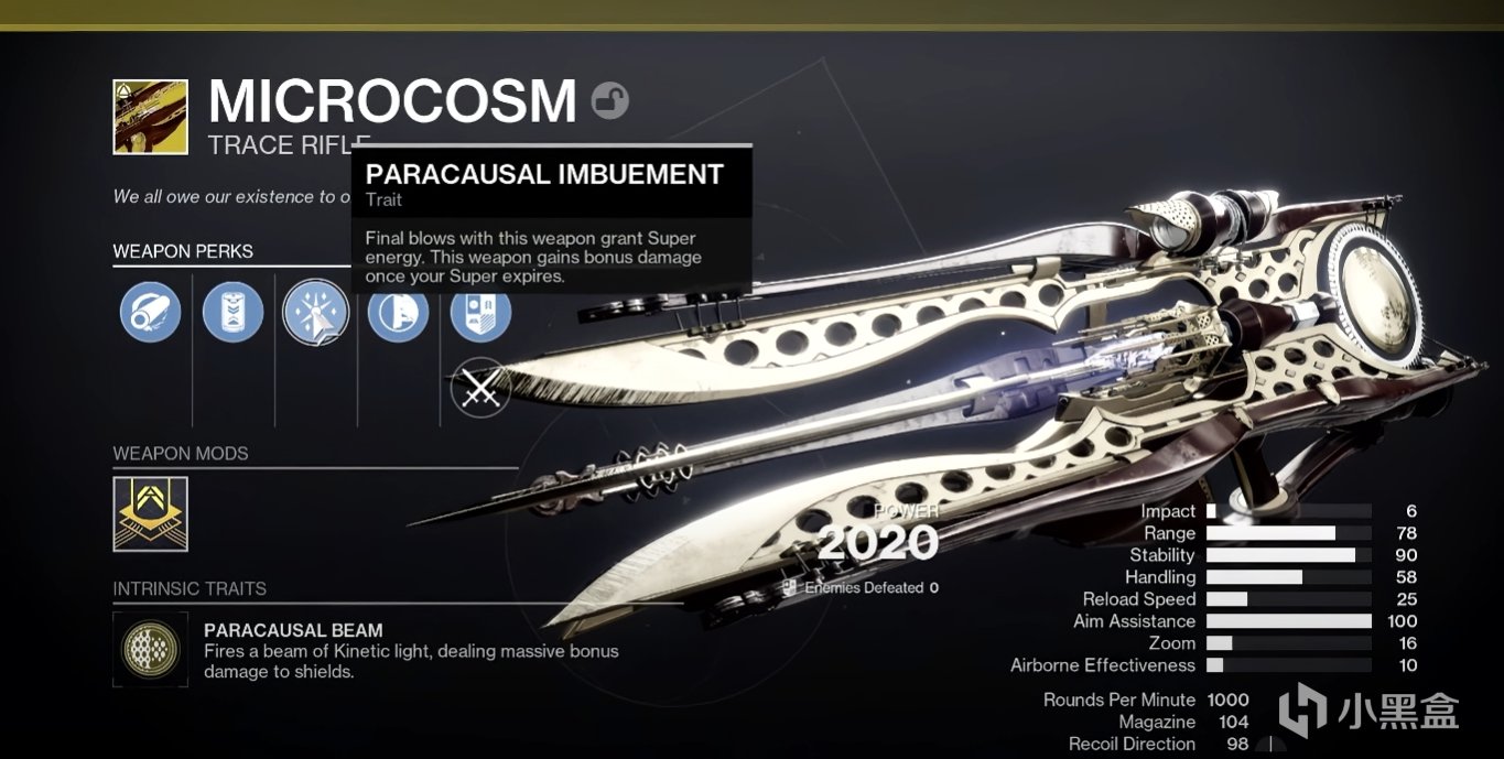 威能彈藥動能追蹤步槍“縮影”,特效“超因果光線”:發射動能光線,對護盾造成超額傷害。特殊perk“超因果灌注”:此武器最後一擊可以獲得額外超能,超能結束後20秒內提高20%傷害