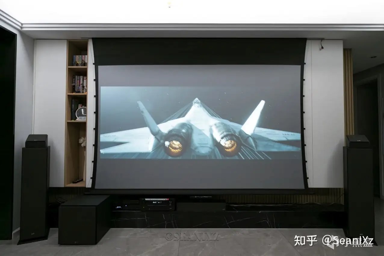 做满一面墙的电视柜,85寸内嵌式的电视机位,120-140寸电动升降幕布,既可以在夜间观影是获得投影的大画幅沉浸感优势,也能搞定会客或者有小孩时在充足环境光下看电视的需求,拼装式的板材后期还可以整体改换风格,美观与功能性兼顾适合发烧友捣腾,这是我自己设计的较为完美的客厅家庭影院柜体方案。