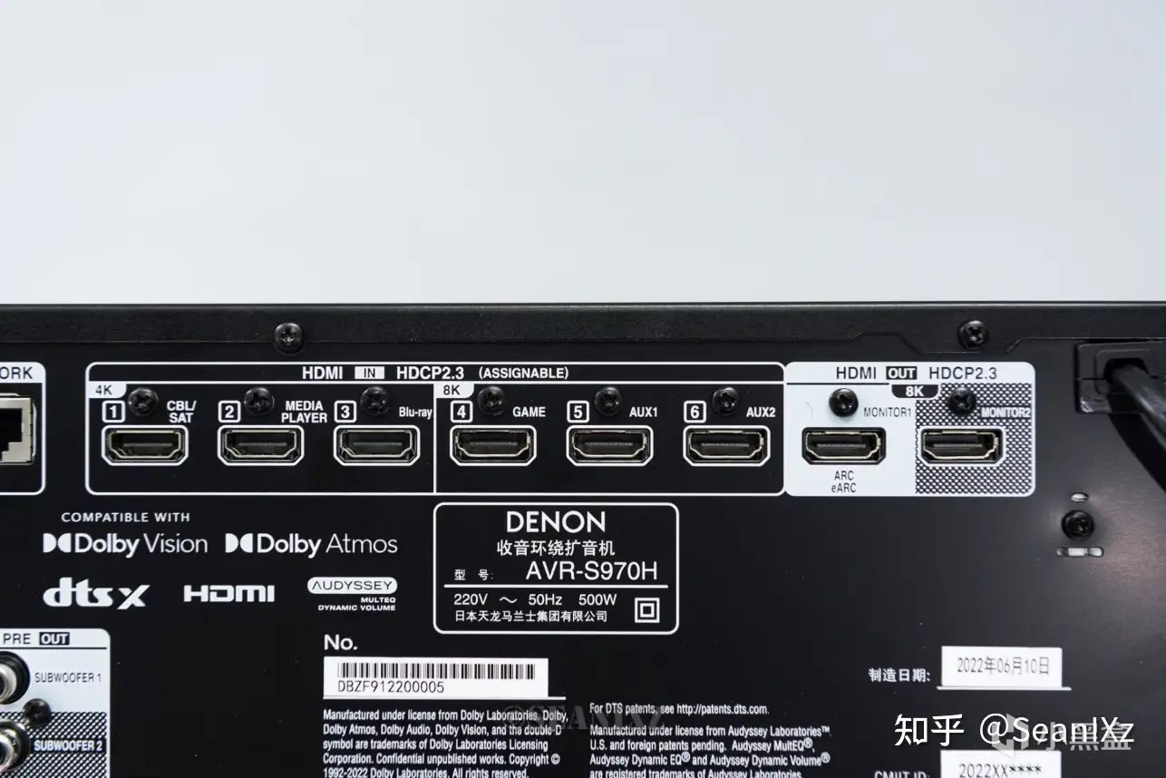 接口方面,给到了6个HDMI 输入和2个 HDMI 输出支持 HDMI 2.1 标准的所有功能:VRR、ALLM、eARC、QMS、QFT、120 fps 的超高清 4K 和每秒 60 帧的 UHD 8K,可以满足当下所有需求,还能最高适配8K视频,接口方面至少5-10年内不会落伍。