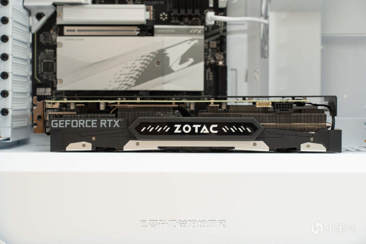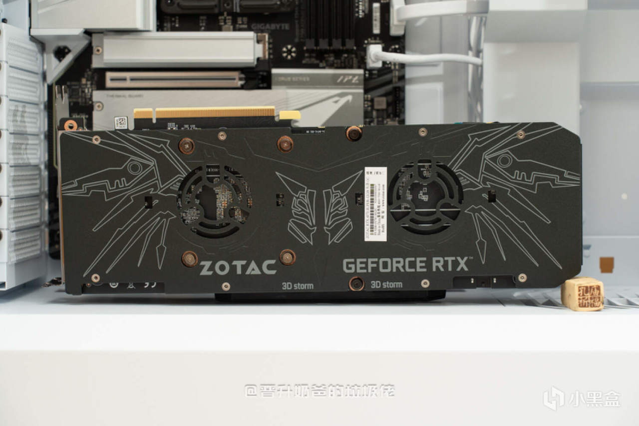 ▼显卡背面采用了黑色金属背板,在左右两侧设计了两个小面积镂空圆孔以及矩形卡扣位,用于安装官方配件“天启之翼”的风扇,对于常规的显卡安装方式来说,天启之翼对于装机颜值的提升是巨大的。