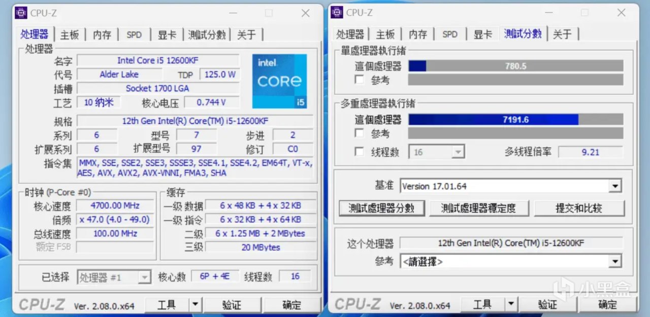 ▼使用CPU-Z对处理器性能进行简单的跑分,最终得出单核成绩为780.5,多核成绩为7191.6,单核性能是13700KF的89.7%,多核性能是13700KF的57.6%。