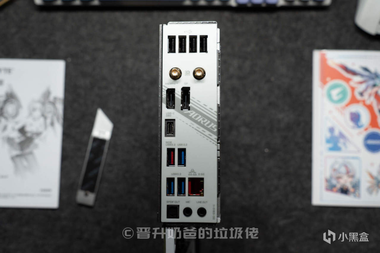 ▼主板接口上相当丰富,提供了4个USB 2.0/1.1接口、WiFi 6E天线接口、1个 DP接口、1个 HDMI接口、1个USB 3.2 Gen2x2 Type-C、1个USB 3.2 Gen2 Type-A、3个USB 3.2 Gen1 Type-A接口、接口以及1个2.5G网络接口和3.5mm音频接口、光纤接口。
