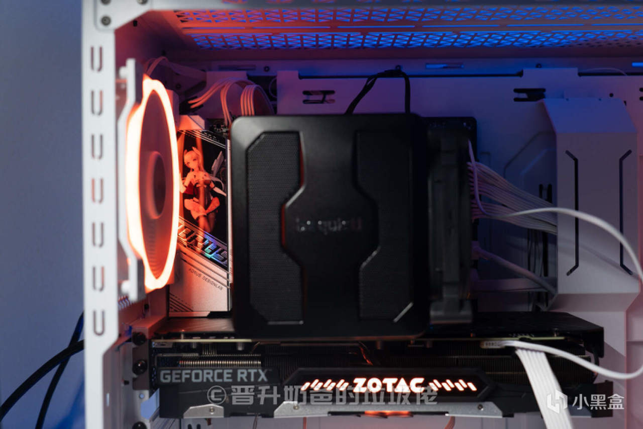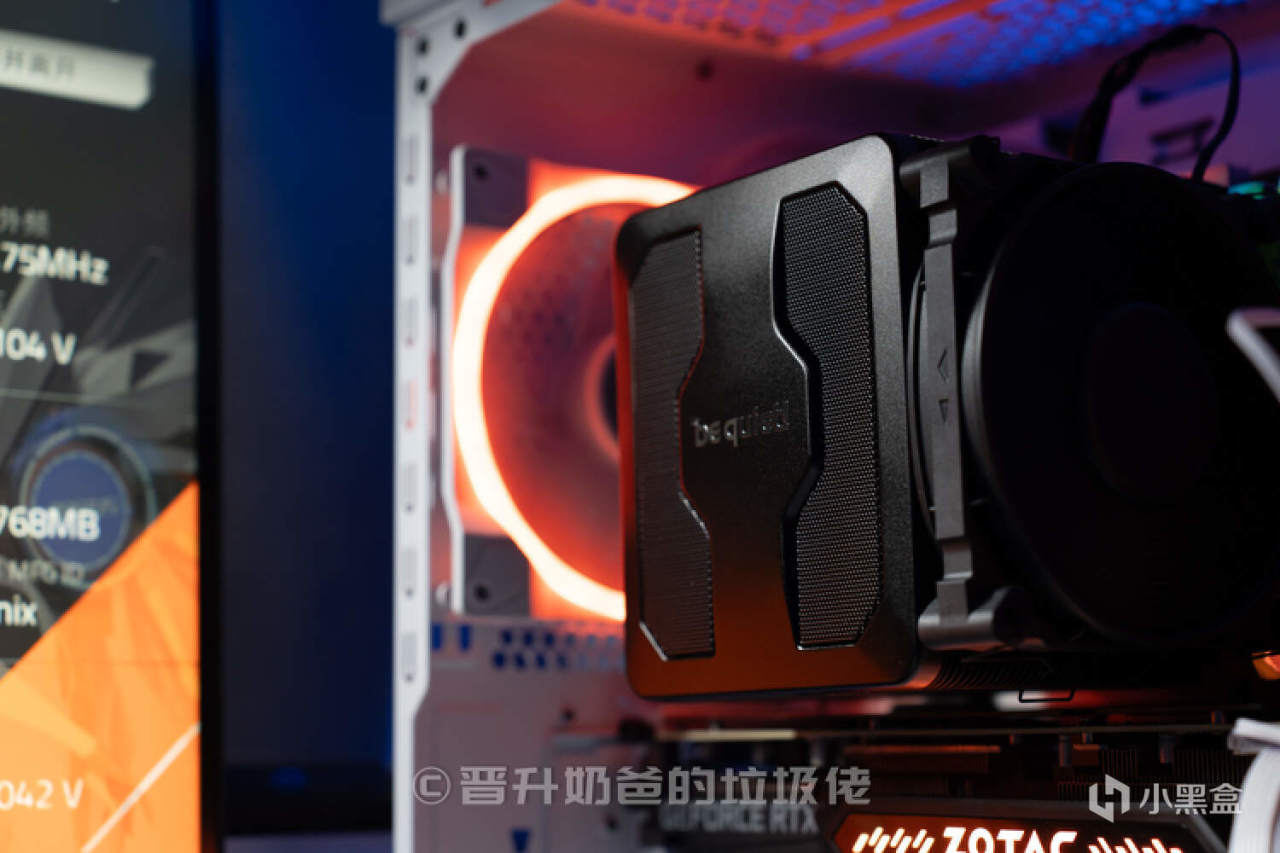 ▼装散热器前记得撕膜,记得撕膜,记得撕膜!重要的事情说三遍,7根6mm纯铜热管能够迅速导出热量。前风扇方向的鳍片做了切口设计,能够更好兼容内存。