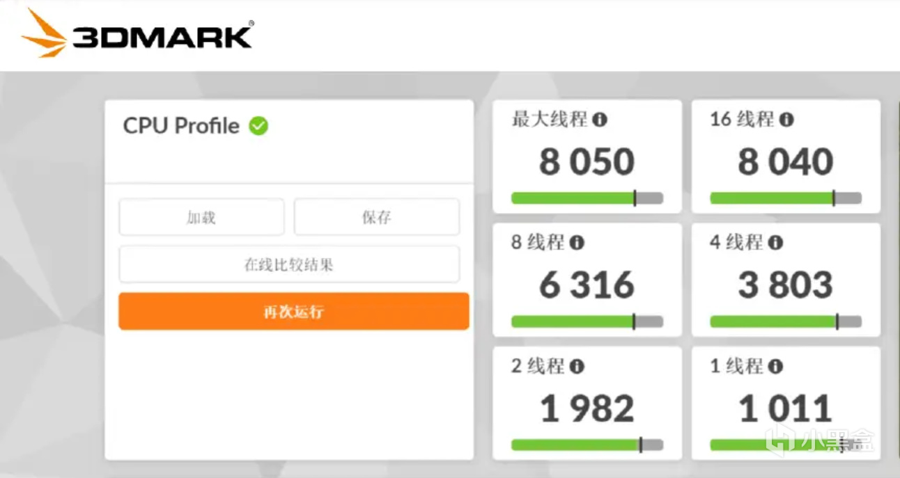 ▼使用3D MARK中的CPU Profile项目对CPU进行基础测试,最大线程分数8050,单线程分数1011,四舍五入约等于以13700KF 40%+的价格买到13700KF 66.7%的性能,其超高的性价比进一步凸显。