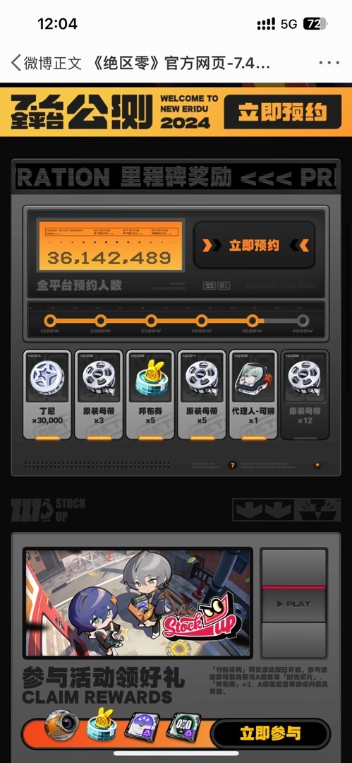 《绝区零》将在2024年7月4日星期四开启全平台公测。据官方数据统计,截止5月29日,《绝区零》的预约人数已超过3600w,并且预约人数还在不断上升。