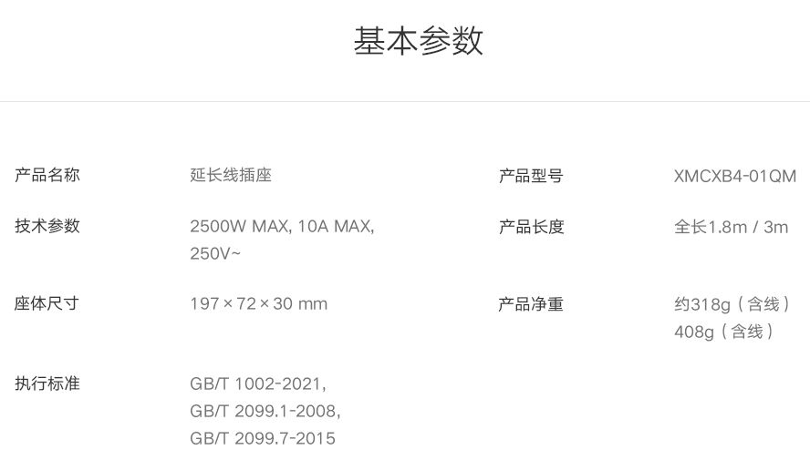 小米 4 位 4 控插线板采用 3 × 1.0 mm² 电源线,配备开关柔光指示灯,拥有 1.8m 和 3m 双规格,适配客厅、卧室、厨房、办公桌等日常场景。
