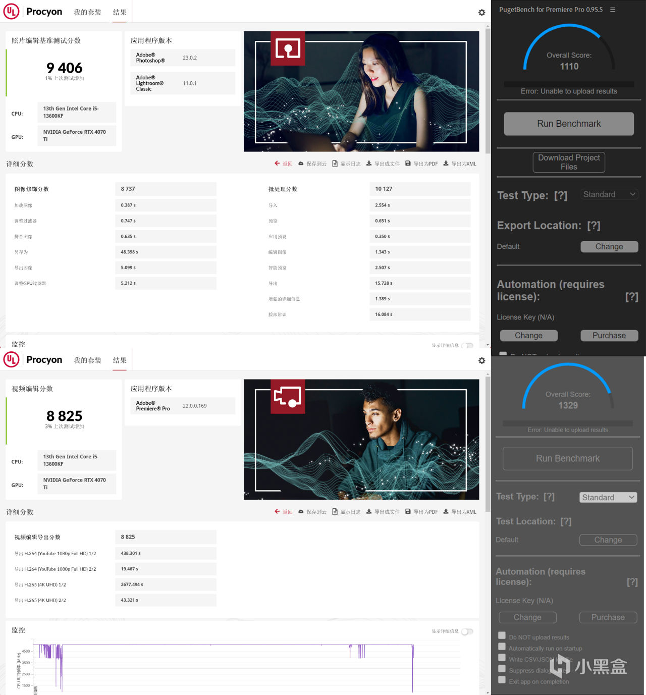 PugeBench 图片处理方面 PugeBench PS 测试得分1329。PugeBench PR 剪辑软件测试得分1110。