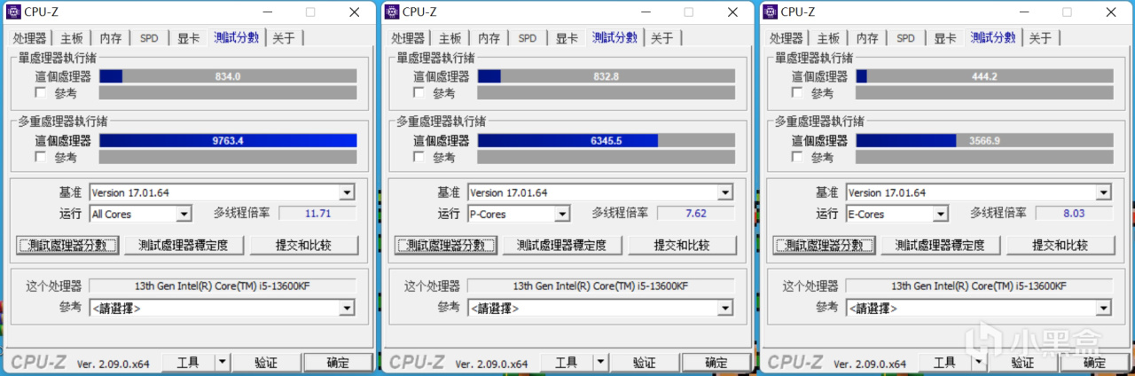 通过CPU-Z跑分可以看到i7-13600KF多核得分10346.9、单核930.0。实际通过测试也可以看到这颗13600KF只是在多核性能上要稍弱于12900K,但是单核性能已经超过12代的i9 了。