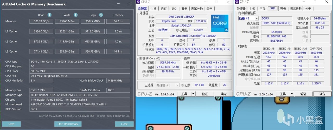 实测搭配i5 13600KF处理器在华硕B760M 重炮手II开启XMP后,7200MHz 频率下的AIDA64 读写测试:100.7GB/s、93.4GB/s、95.0GB/s;延迟为66.2ns。
