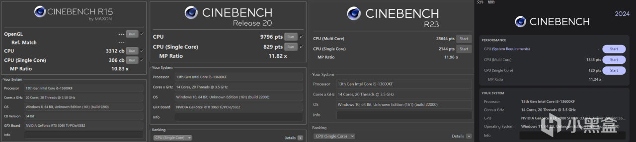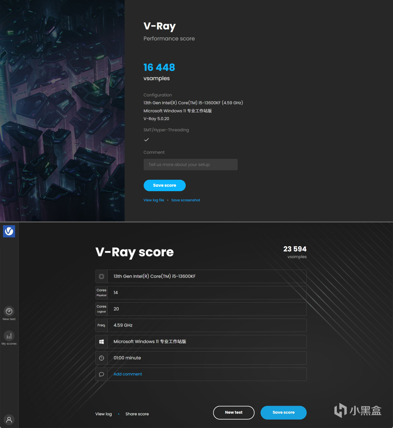 生产力方面选择了两个版本的V-Ray测试13600KF处理器性能。