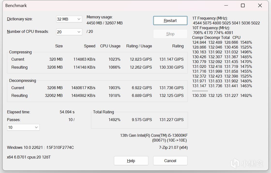 「7 Zip 压缩测试」:压缩得分 130.330GIPS,解压缩 132.125GIPS,总分 131.227GIPS
