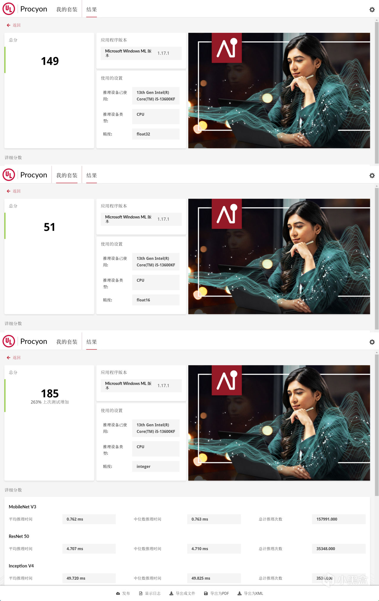 Procyon的Ai测试方面,这款13600KF的测试表现大家也可以参考一下。「Intel OpenVINO - CPU」:float32 / 149 分、float16 / 51分、integer / 185分。