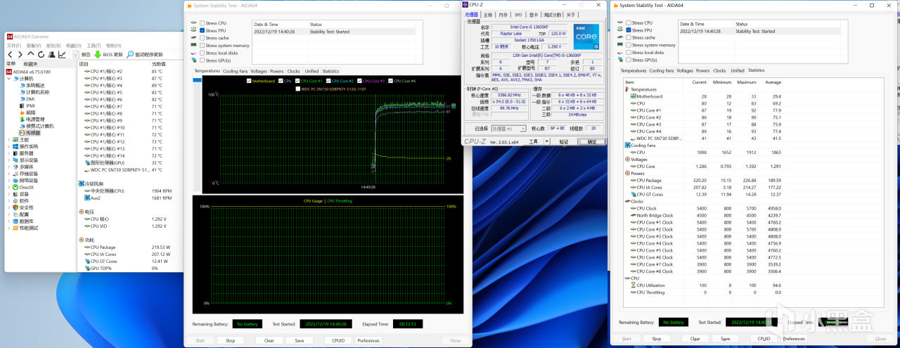 压力测试方面可以看到搭配B760规格的主板也可以实现220W左右的性能释放,整体温度也被控制在90℃以内,而且搭配华硕的AI超频功能,全核5.4GHz的表现也是非常可观了。