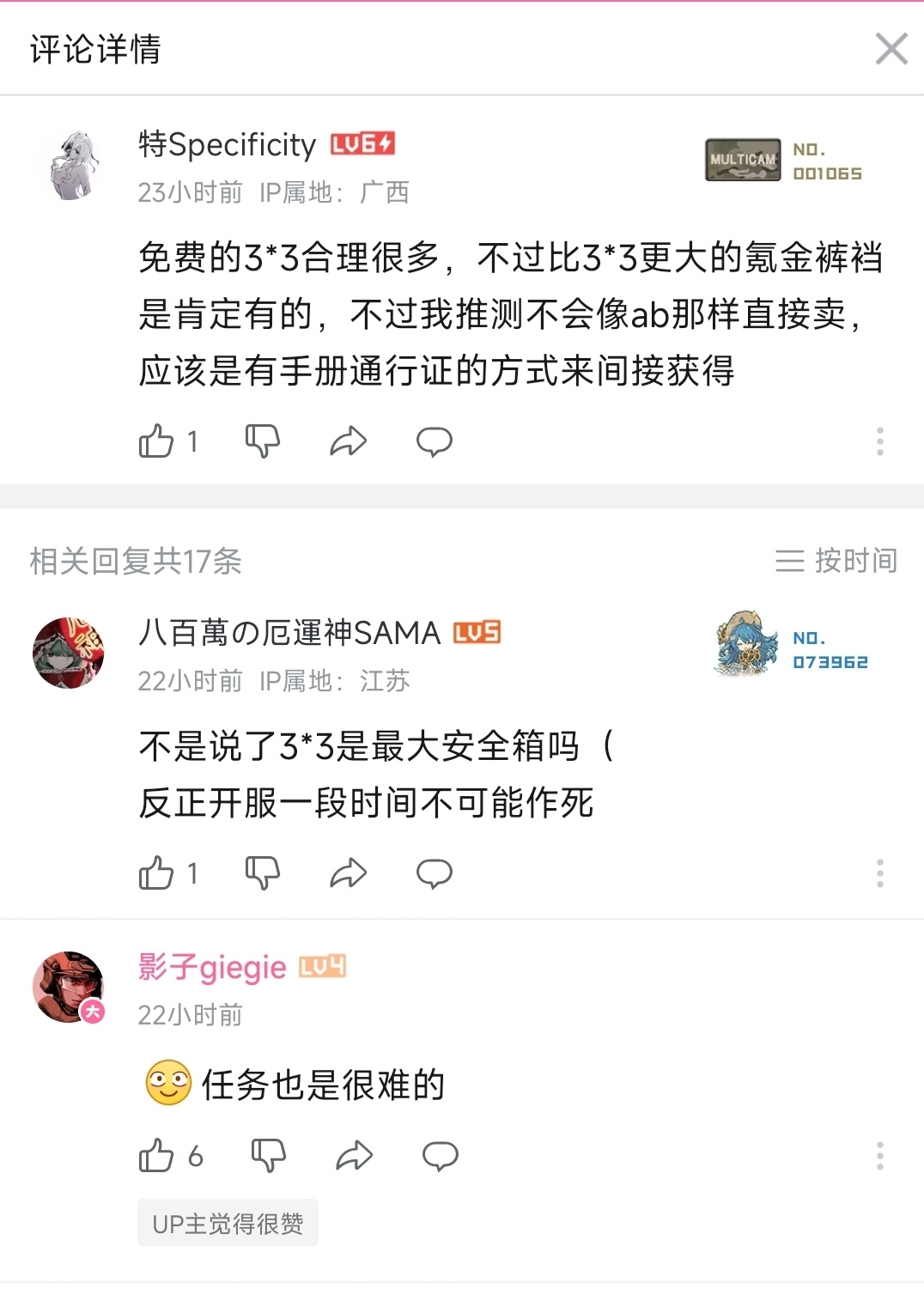 后续, B 站 up 主 Key725 更新了视频表示其获得了小道消息,该消息称最大的 3×3 保险箱只能通过肝任务获得,而无法使用钞能力直接氪,且最大的可氪金获得保险箱为 3×2 的规格。