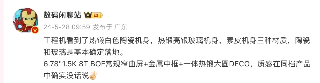 5 月 28 日消息,据数码博主 数码闲聊站 今日爆料,一加 Ace 3 Pro“工程机”目前拥有“热锻白色陶瓷机身”、“热锻亮银玻璃机身”、“素皮机身”三种材质。