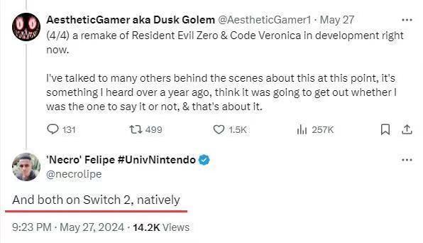 而Felipe Lima还补充了一个信息,表示这两款重制版游戏也将会登陆任天堂的下一代主机Switch 2(暂定名称),而且是原生本地运行(非串流云游戏)。