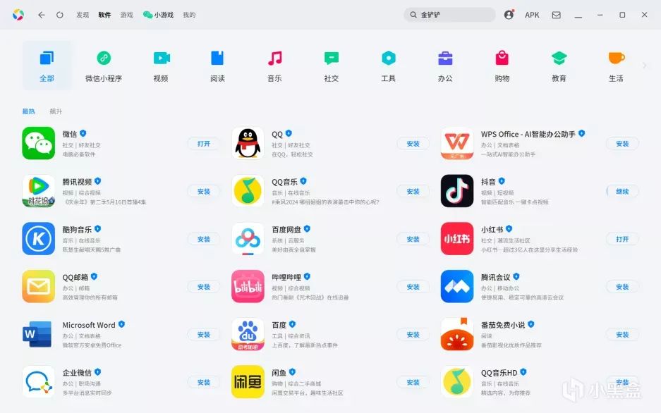 打开界面,几乎手机上的常用 APP都有,比如微信、QQ、抖音、快手、淘宝、京东、支付宝等等,而且还有很多游戏,比如王者荣耀、和平精英、穿越火线等等,可以说是应有尽有。不过也有一些还未上架的 APP,好在它可以用过 APK安装。