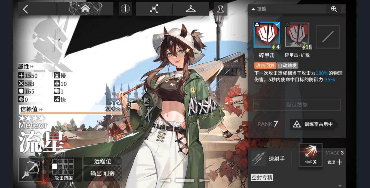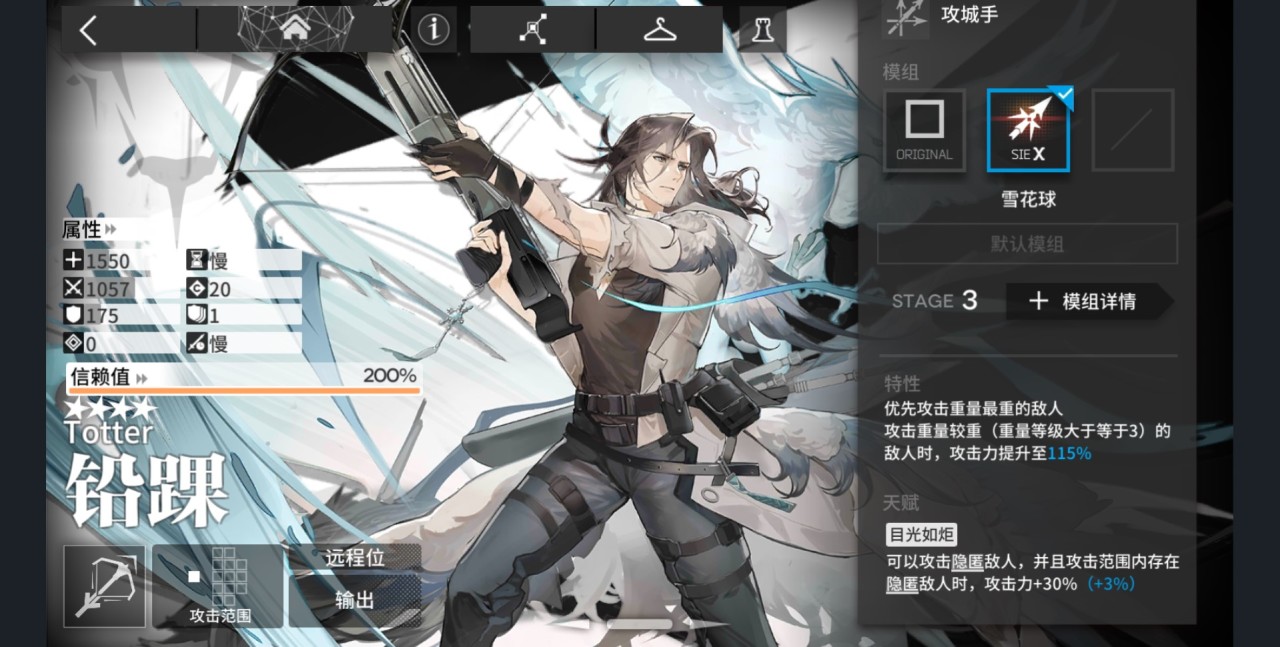 二技能开启能攻击三个敌人,对单则伤害翻倍,我的评价是普普通通:就是一个伤害性技能,论输出也轮不到他。主要攻城手的攻击范围四星独此一家,还有攻击隐匿敌人天赋(其实也没怎么用到)