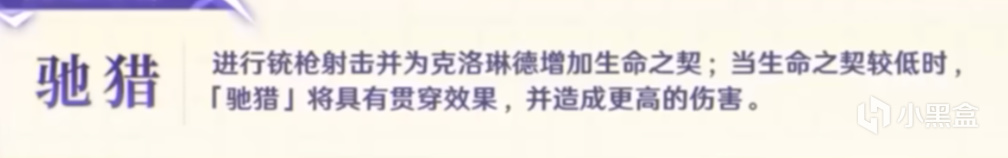 而克洛琳德释放元素战技后,普攻和E技能将分别转换为进行铳射击的“驰猎”,进行突进剑攻的“贯夜”。其中驰猎的攻击将会增加克洛琳德的生命之契,而“贯夜”则是清除克洛琳德身上的生命之契。以上两种方式,会根据当前生命之契的总量,发挥不同的效果。当生命之契较低时,驰猎攻击将具有贯穿效果,并造成更高伤害,当生命之契较高时,贯夜将具有更大的攻击范围和更高的伤害。