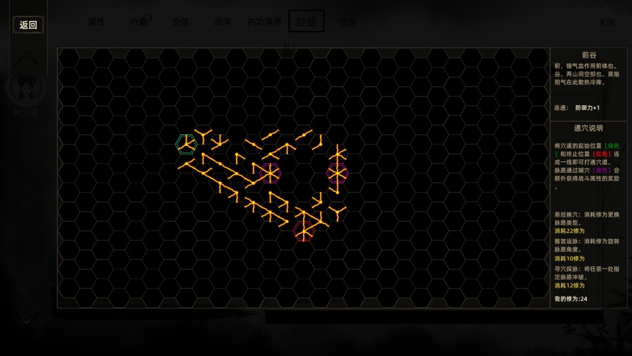 而作爲輔佐,玩家可以從經絡系統中獲得更多的細分屬性——通過各個正六邊形中線條的更換、旋轉,連接打通穴道的起始和終結獲取相應屬性,並通過輔穴時獲得額外屬性。