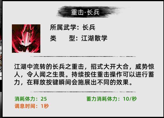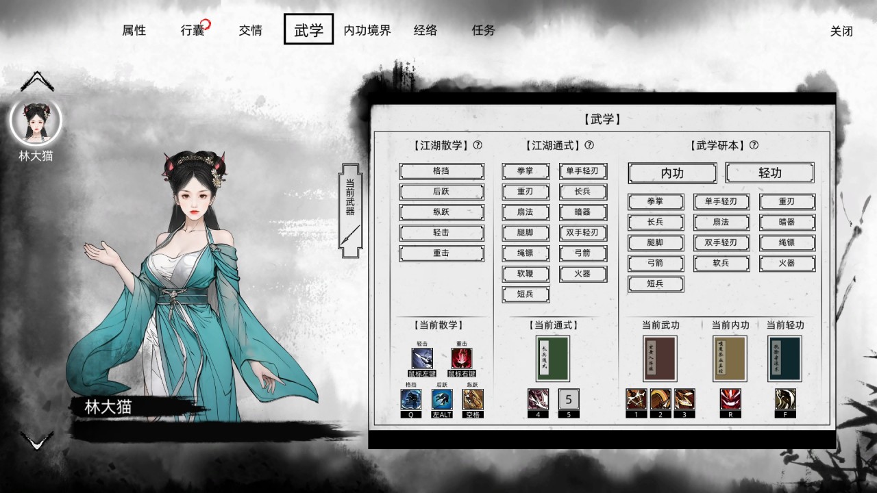 武學系統可以近似看成技能系統,通過在世界中不斷收集祕籍武學,玩家就可以更換招式技能,提供自由的搭配玩法,而這點也是此類遊戲所崇尚的,即玩家所控制的角色不拘泥於少數幾種兵器的使用,更多、更豐富的武器選擇讓遊戲的戰鬥過程變得更加有趣、多變(但目前demo無法獲取太多的武學,倒是也不太好體驗完全)。