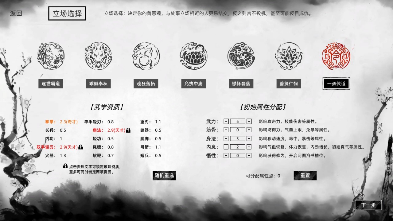 一是體現在創建角色的天賦、外觀、屬性、武學資質乃至立場等都可以自由分配點數進行選擇,特別是這個立場的自定義頗有趣味——《刀劍江湖路》並不需要玩家一定要選擇當一個正義的大俠,通過創建時立場的選擇以及實際遊戲中善惡值的設定,或許可以讓玩家在後續章節中,一如《俠客風雲傳》那般,選擇不同的路線與結局。