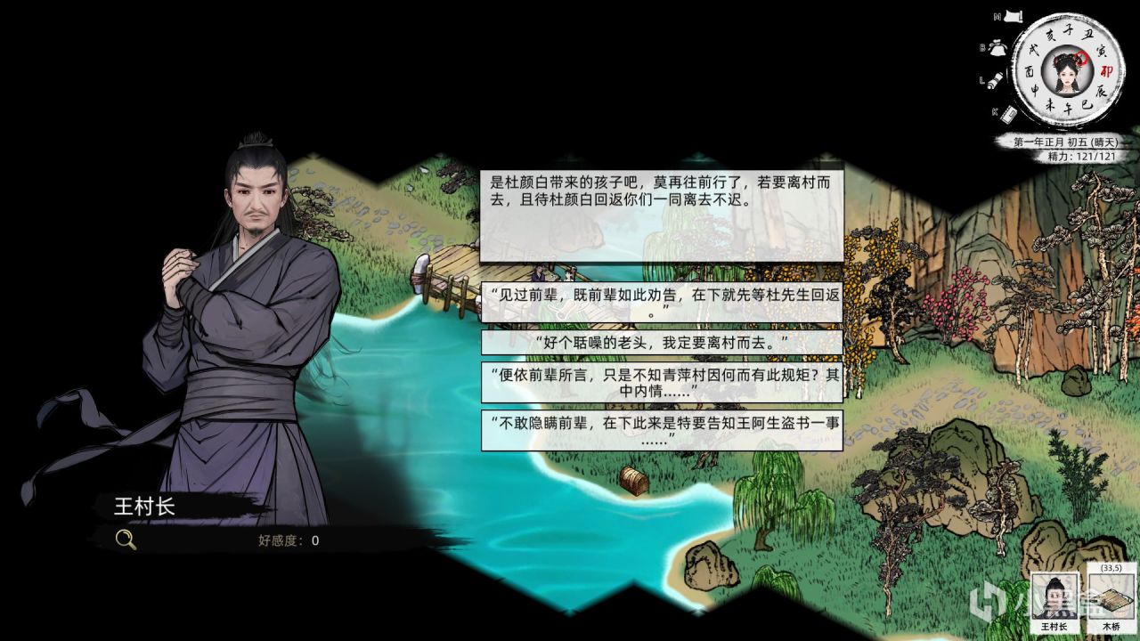 三是體現在劇情的自由抉擇上,玩家可以自由選擇部分劇情內容,比如王阿生盜書後前去王村長處,既可以坦白告知盜書一事,也可以幫王阿生隱瞞,將會決定玩家與NPC的好感度和善惡值的增減。