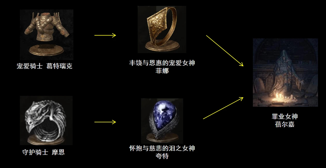 還記得1代“金閃閃”羅特雷克的故事劇情嗎?作爲寵愛女神菲娜“懷抱”的騎士,他對防火女有着畸形的感情,這和本作中的摩恩、伊果相當類似。作爲寵愛女神,菲娜在1代裏的出場次數並不多,但從“懷抱”、“守護”等概念上來看,菲娜也是蓓爾嘉的化名馬甲之一。有關這一推論,對理解本作中的核心謎題:“重生之母”羅莎莉亞身份而言,是非常關鍵的,我們將在後文的合適時機進行敘述。
