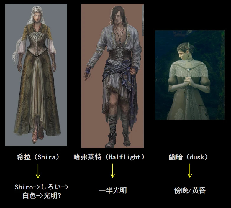 三位明確屬於烏拉席露的人類,其中halflight的名字饒有趣味,加上1代的幽暗公主,不得不讓人懷疑烏拉席露人取名有何象徵含義(由光轉暗?)。當然,希拉的名字在英文裏是個很普通的女性名字,但日語似乎能聯想到白色,總體來說還是有點臆斷,僅供參考。