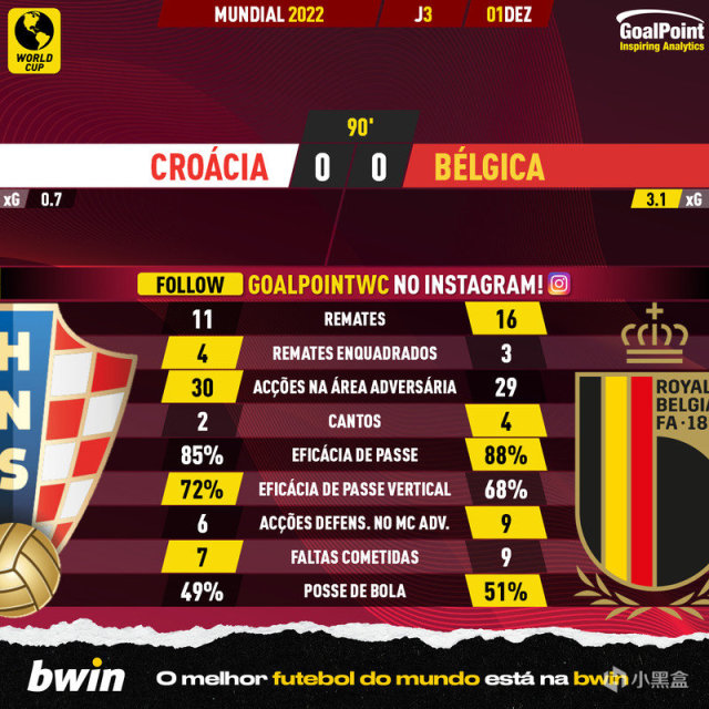 世界盃F組焦點戰,比利時對陣克羅地亞,上屆世界盃的二三名之戰!上半場第14分鐘,卡拉斯科送克羅地亞點球,但VAR判定越位在先點球被吹掉!下半場,德布勞內做球,盧卡庫兩次空門不進,後面多次錯失良機,最終比利時 0-0 克羅地亞被淘汰!隔壁摩洛哥對陣加拿大,齊耶赫開場利用對方失誤閃電破門,恩-內斯里擴大比分,阿格爾德打入本屆世界盃第一個烏龍球,最終摩洛哥頭名出線,克羅地亞小組第二,比利時則慘遭淘汰,黃金一代落幕告別世界盃!