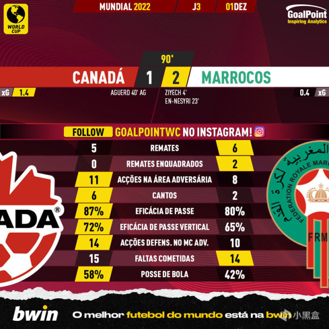 上半場,開車第4分鐘,加拿大後衛傳球力度小了,門將主動出擊將球送到對方球員腳下,齊耶赫吊射破門,摩洛哥 1-0 加拿大!第7分鐘,霍伊萊特剷倒歐納希染黃!第23分鐘,恩-內斯里得球突入禁區右側小角度抽射破門,摩洛哥將比分擴大至2-0!第40分鐘,阿德庫貝左路傳中,阿格德攔截時不慎用腳尖捅進了自家大門,打入世界盃首粒烏龍球!